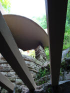Wright's first design for Booth's house, bottom photo, was never built. It involved a bridge over a revine, leading directly to the building itself. A two-story living room extends down into the ravine, and wings spread out from the central living room core to other levels.