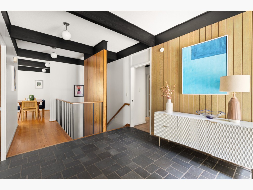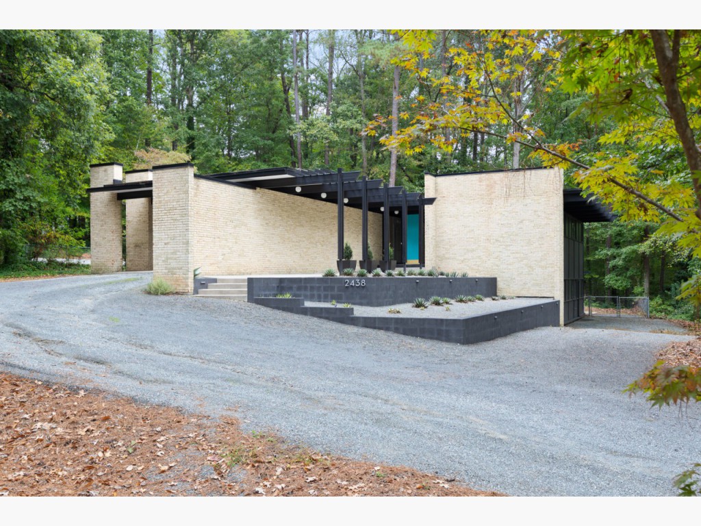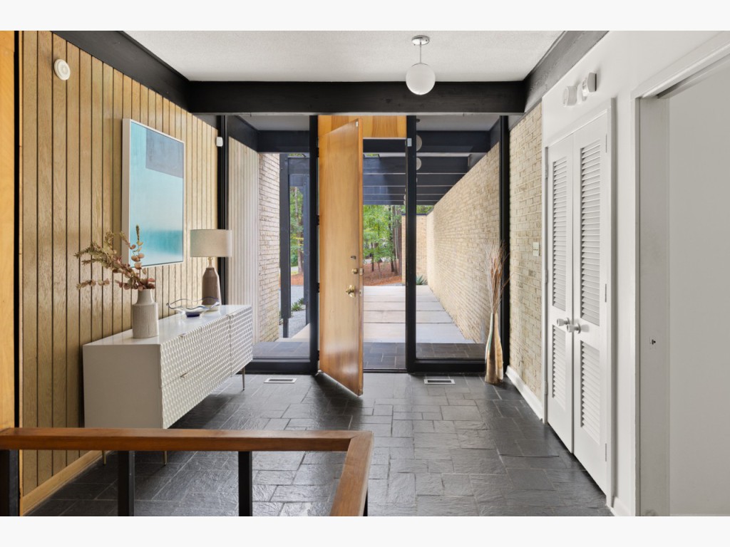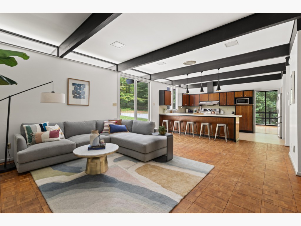 A rare opportunity in the fall market, the Frank and Berniece Daddario House is a well-preserved example of mid-century modern design. Eligible for the National Register of Historic Places, it features clean lines, extensive glazing, and a highly functional floor plan that reflects its architectural heritage. Set on over an acre of wooded land, the thoughtful siting and gradual approach create a strong sense of arrival. Post and beam construction with a consistent grid system visible from the patterned concrete patios to the exposed ceiling beams reinforces this property's intentional design. The main level offers spacious areas for living, dining, cooking, and relaxing, with a refined mix of slate, glass, and brick throughout. The lower level, the majority of which is above grade, includes additional bedrooms, office space, a workshop, and another living area. True to its mid-century design, many rooms connect directly to patios and outdoor spaces. Recent updates include flooring, bathrooms, HVAC, hardscaping, and more, allowing the original architecture to shine. Located less than 4 miles from downtown, this home offers a unique blend of style, space, and convenience.