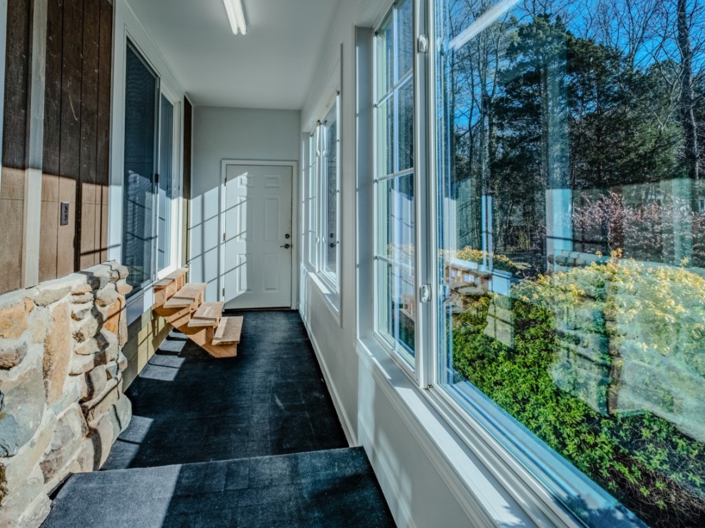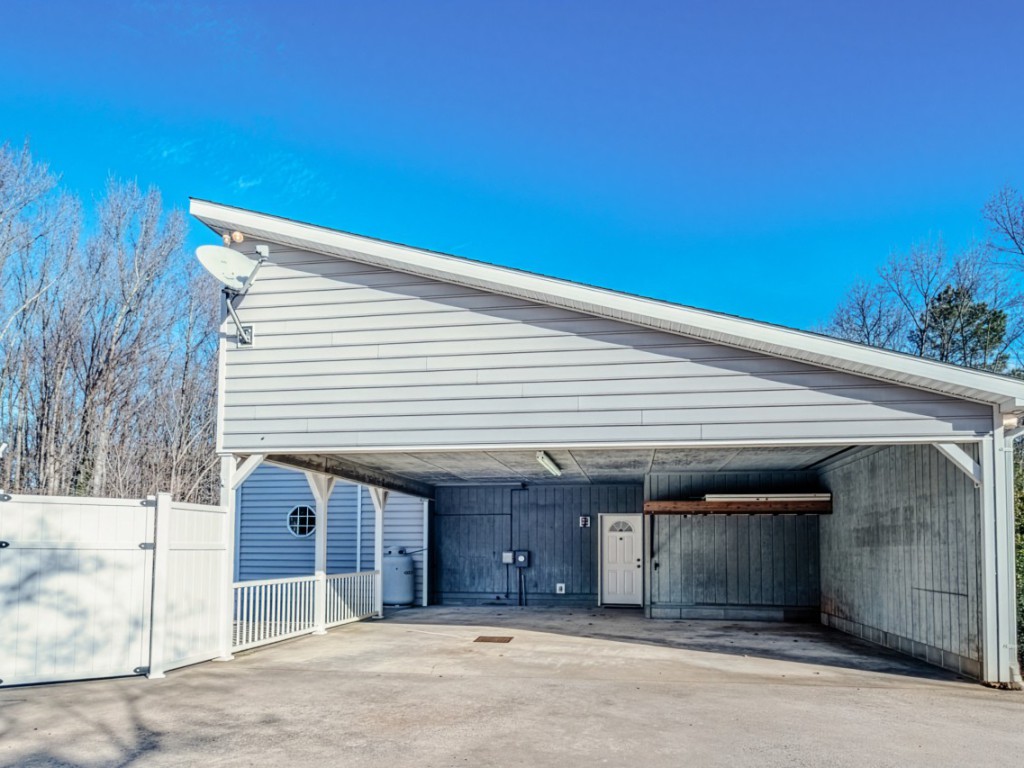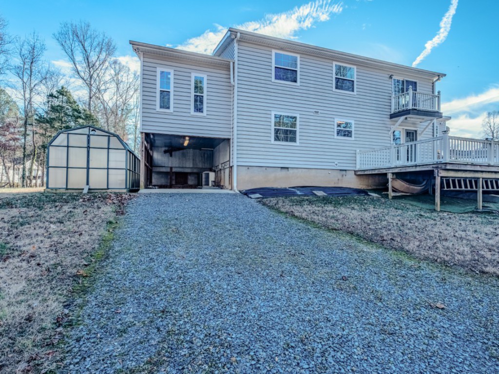 A gravel drive leads from the front driveway to a lower-level one-car carport at the rear of the home. The pool area includes a built-in pool shed within the decking, with stored pool supplies and chemicals conveying. The pool is currently winterized and covered, and a pool slide stored under the deck conveys as well. A greenhouse, encapsulated crawl space, and the private, wooded backyard complete this one-of-a-kind property.