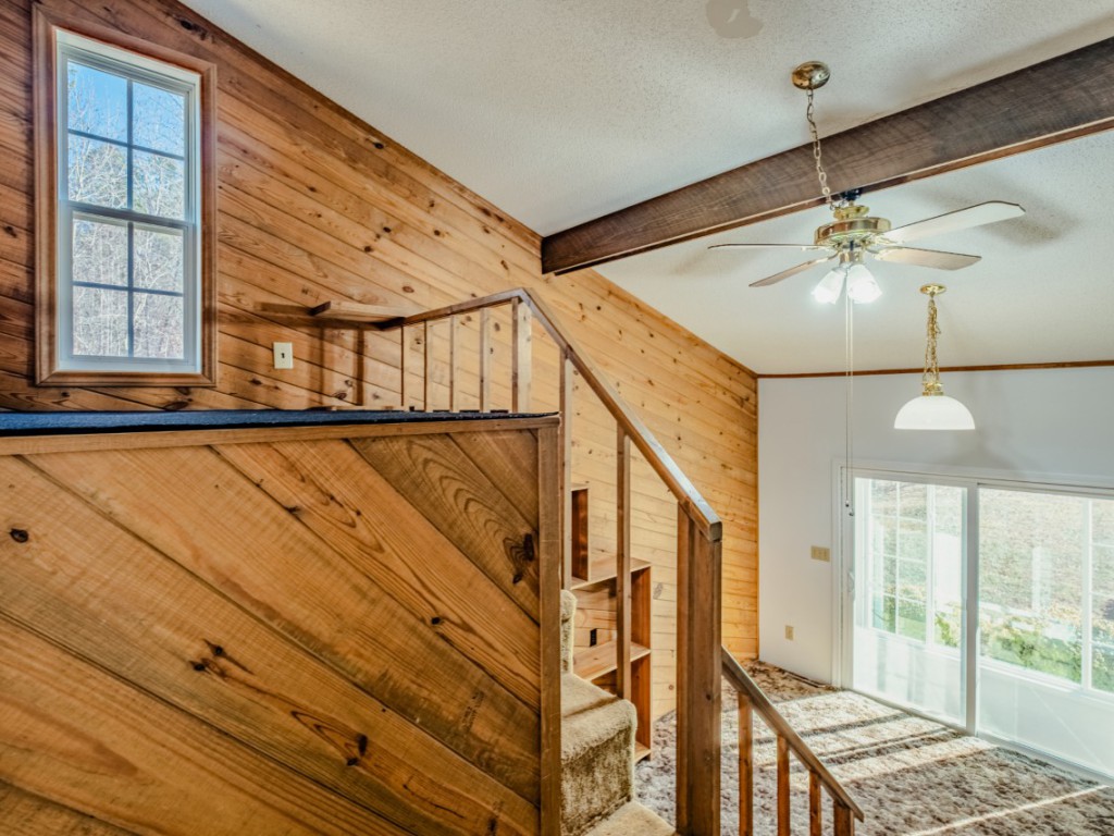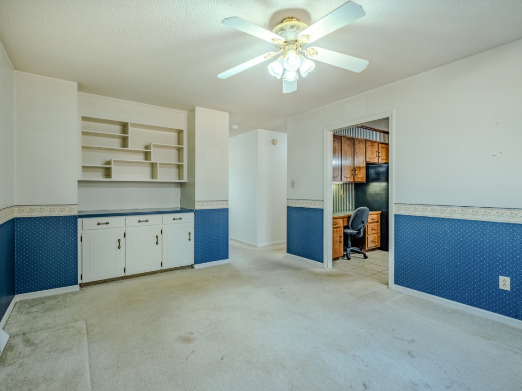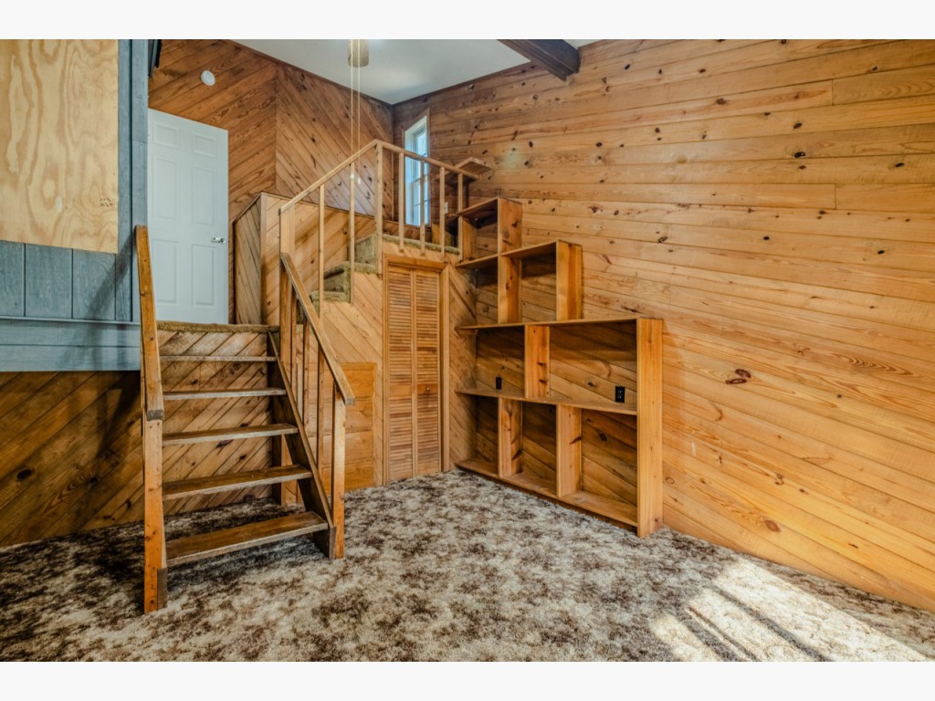 Step down to the sunroom, also accessible from a two-story bedroom with a built-in raised bunk, creating a fun, treehouse-like sleeping experience. The main level also includes a convenient powder room, large hall closet, and an office/flex space with built-in shelving, laundry closet with washer and dryer included, and direct access to the two-car carport with an enclosed corner workshop. Up a half level, a bedroom currently set up as a craft room offers extensive built-ins, four floor receptacles, and two closets with abundant shelving.