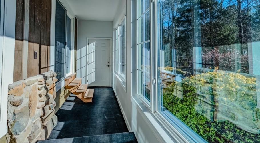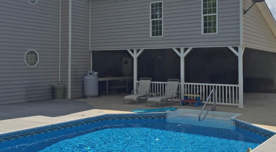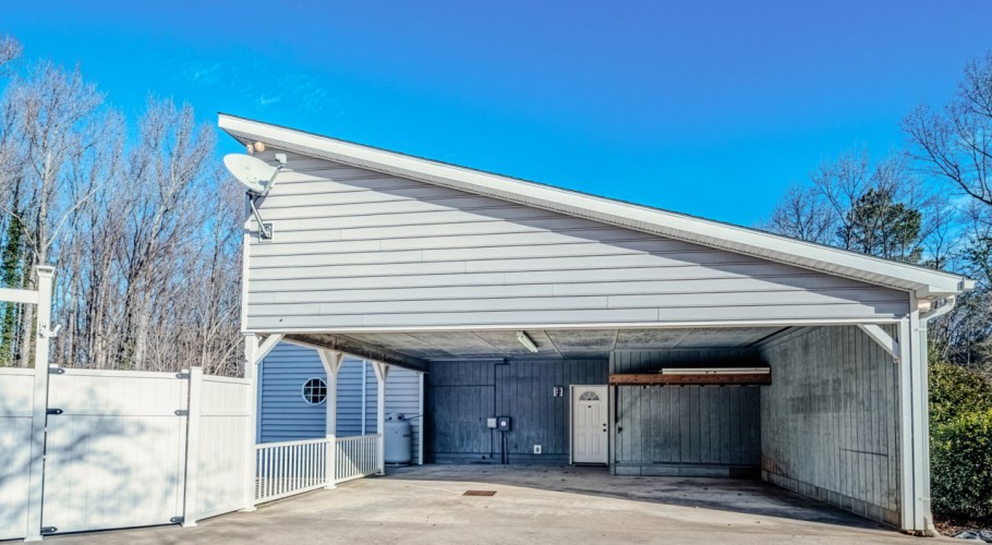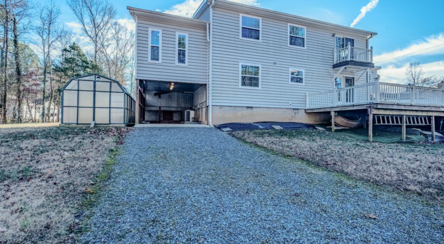 A gravel drive leads from the front driveway to a lower-level one-car carport at the rear of the home. The pool area includes a built-in pool shed within the decking, with stored pool supplies and chemicals conveying. The pool is currently winterized and covered, and a pool slide stored under the deck conveys as well. A greenhouse, encapsulated crawl space, and the private, wooded backyard complete this one-of-a-kind property.