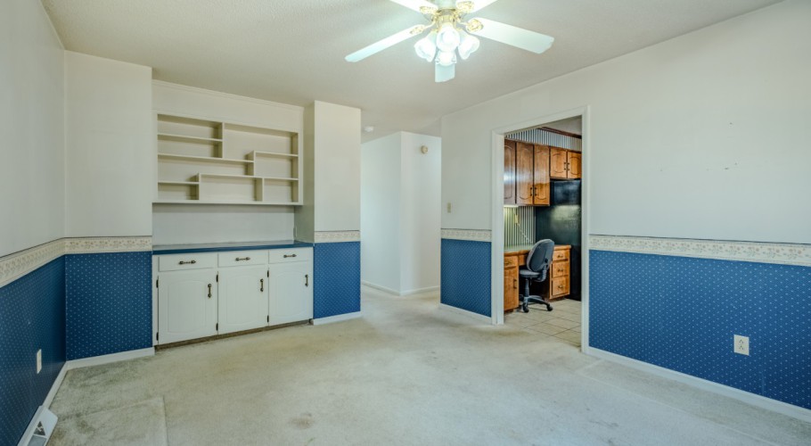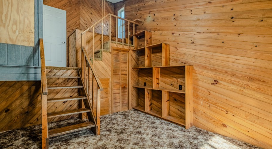 Step down to the sunroom, also accessible from a two-story bedroom with a built-in raised bunk, creating a fun, treehouse-like sleeping experience. The main level also includes a convenient powder room, large hall closet, and an office/flex space with built-in shelving, laundry closet with washer and dryer included, and direct access to the two-car carport with an enclosed corner workshop. Up a half level, a bedroom currently set up as a craft room offers extensive built-ins, four floor receptacles, and two closets with abundant shelving.