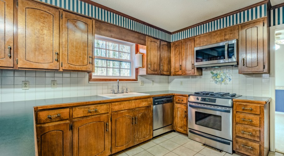 The great room opens to the back deck and features a gas log fireplace, flowing seamlessly into the kitchen with breakfast bar, tile flooring, pantry, computer niche, and Kenmore Elite stainless appliances, including a gas range and refrigerator. The adjacent dining room overlooks the backyard, creating a pleasant space for everyday meals or entertaining. The living room impresses with a soaring vaulted ceiling and skylights that flood the space with natural light.