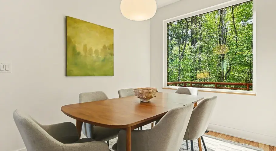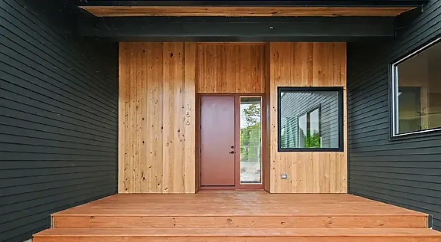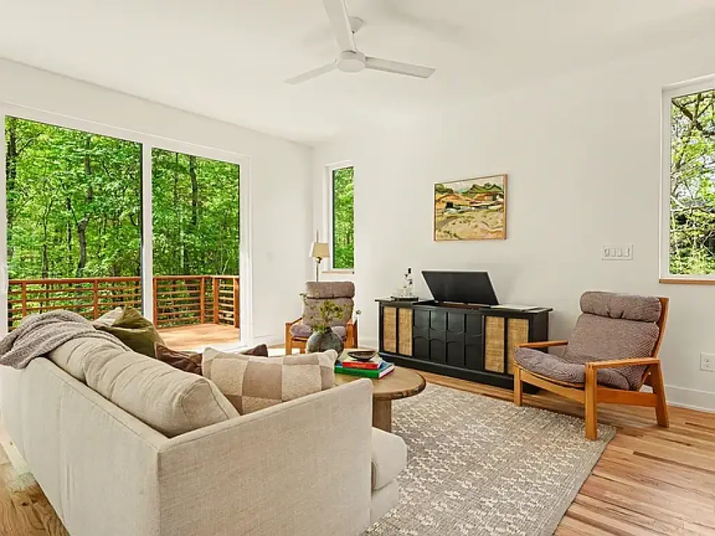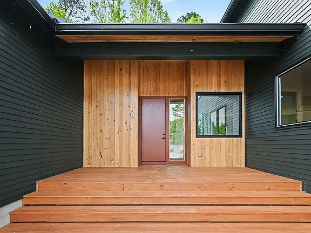 Front and rear decks extend the living space outdoors, making it easy to move between inside and out. The home is part of a small group of neighboring houses designed by the same architect—each distinct, but related in scale and approach, and each responding to its specific site. It’s an uncommon level of continuity for new construction in the area, giving the neighborhood a cohesive feel without repetition.