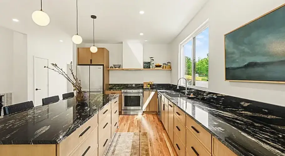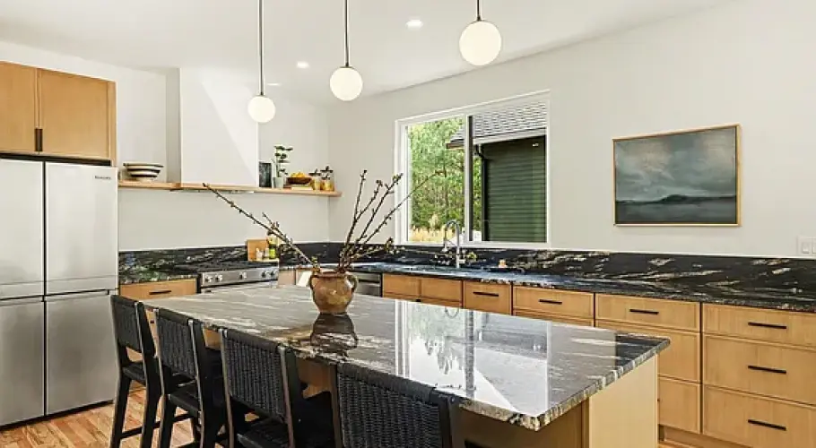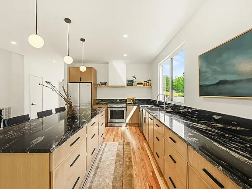 The kitchen sits at the center of the home, opening directly to the dining and living areas to create one continuous space. Streamlined cabinetry, stone countertops, and a gas range keep the palette simple and durable, while site-finished hardwood floors run throughout for a cohesive feel. Tile selections and installation were handled with the same level of care, adding subtle detail without overwhelming the spaces.
