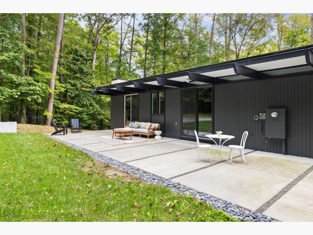 A rare opportunity in the fall market, the Frank and Berniece Daddario House is a well-preserved example of mid-century modern design. Eligible for the National Register of Historic Places, it features clean lines, extensive glazing, and a highly functional floor plan that reflects its architectural heritage. Set on over an acre of wooded land, the thoughtful siting and gradual approach create a strong sense of arrival. Post and beam construction with a consistent grid system visible from the patterned concrete patios to the exposed ceiling beams reinforces this property's intentional design. The main level offers spacious areas for living, dining, cooking, and relaxing, with a refined mix of slate, glass, and brick throughout. The lower level, the majority of which is above grade, includes additional bedrooms, office space, a workshop, and another living area. True to its mid-century design, many rooms connect directly to patios and outdoor spaces. Recent updates include flooring, bathrooms, HVAC, hardscaping, and more, allowing the original architecture to shine. Located less than 4 miles from downtown, this home offers a unique blend of style, space, and convenience.