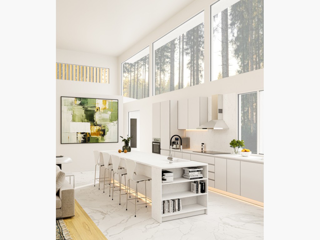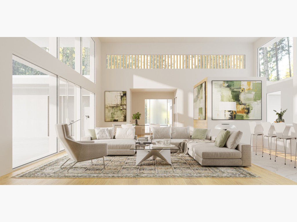 This one-level home is a triumph of deliberate, solid-core doors, sleek finishes, & soaring windows that blur the lines between inside & out.