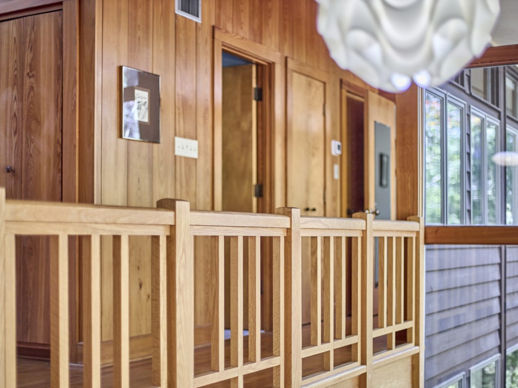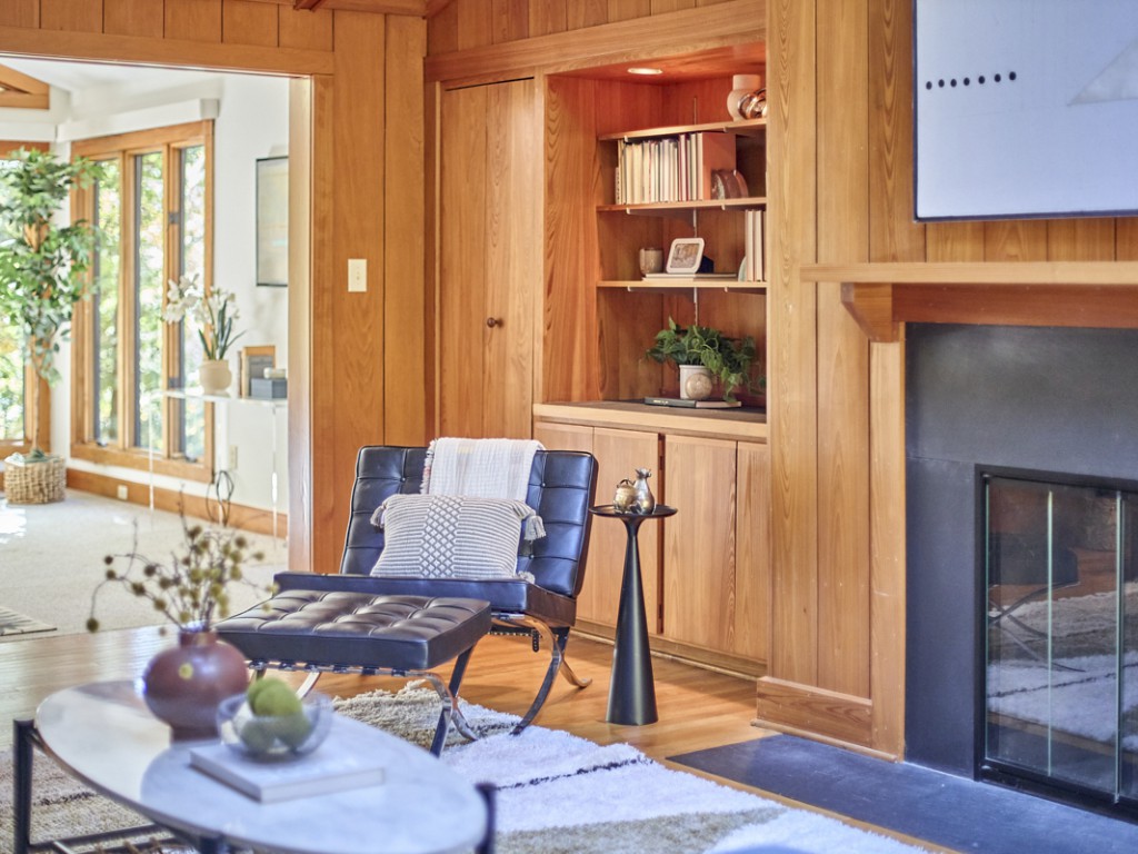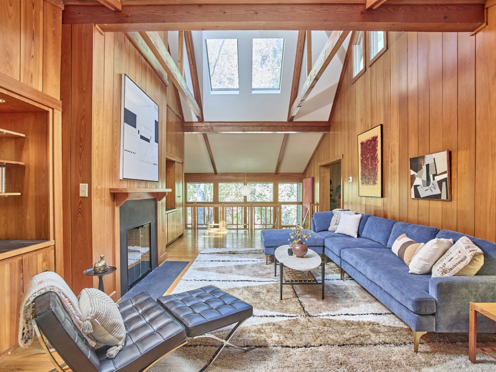 Expansive walls of glass and a soaring vaulted ceiling create an effortless connection to nature. Skylights bounce light around the space, while treed views create a sanctuary of serenity and calm. Original design details abound: A slate floor entry, lovely hardwoods, custom cabinetry, rich wood paneling, a dumbwaiter, solid core doors and a cozy wood-burning fireplace—reflecting the timeless craftsmanship of Webb's vision. A shoji screen leads to the bright sunroom at the rear of the house, perfect for reading or bird watching.