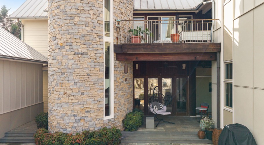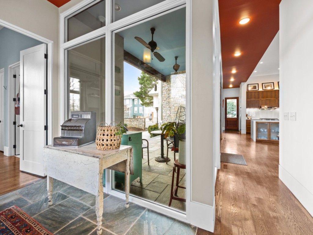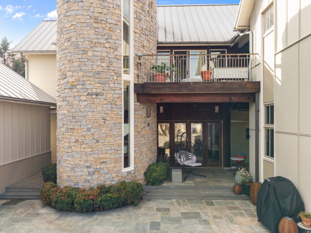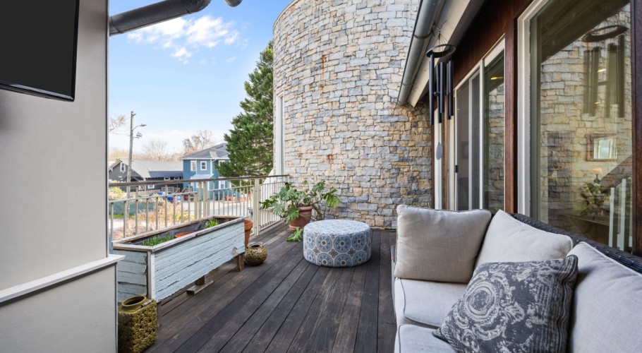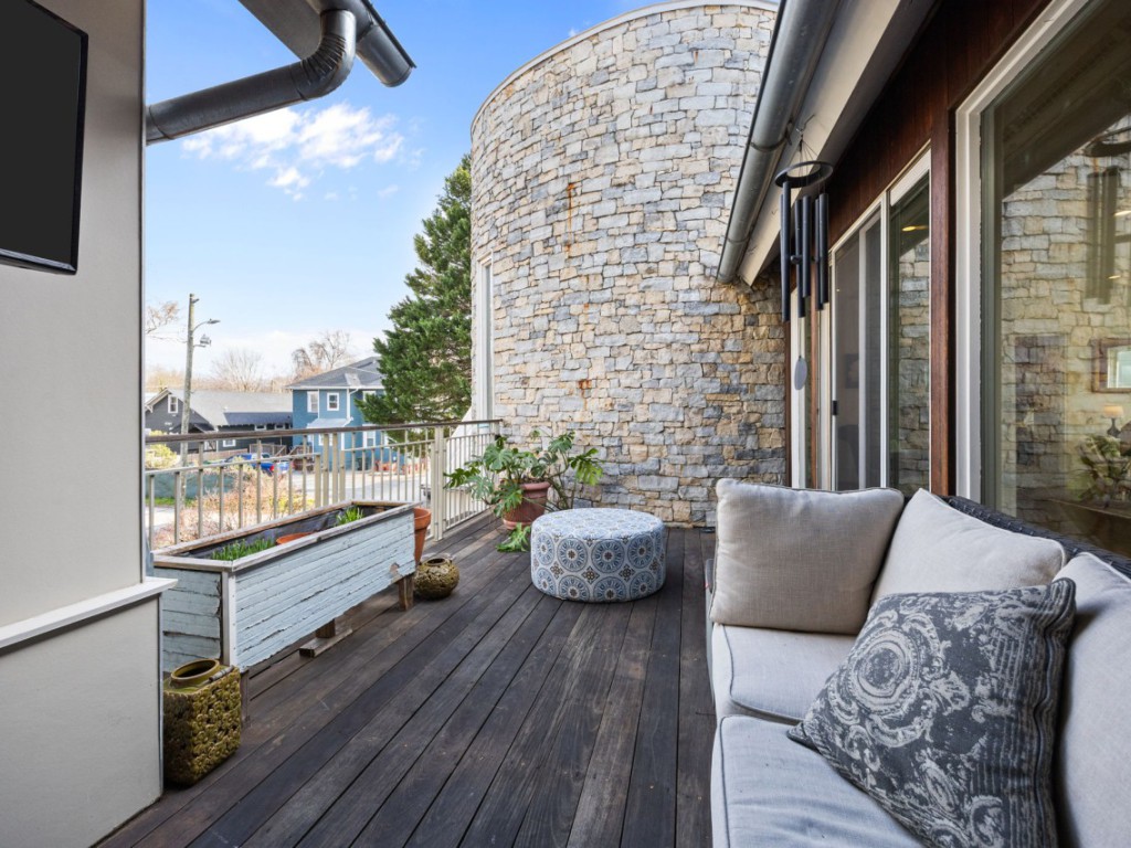 One of the home’s best features is its connection to the outdoors. Glass openings and NanaWall-style doors lead to a private stone courtyard with patio space, landscape lighting, and built-in speakers, creating a rare indoor-outdoor experience in downtown Raleigh. Upstairs, the primary suite includes a spa-style bath, generous custom closet space, and a private sun porch/balcony retreat. The third floor adds bonus space, built-in seating, extra storage, and skyline views.