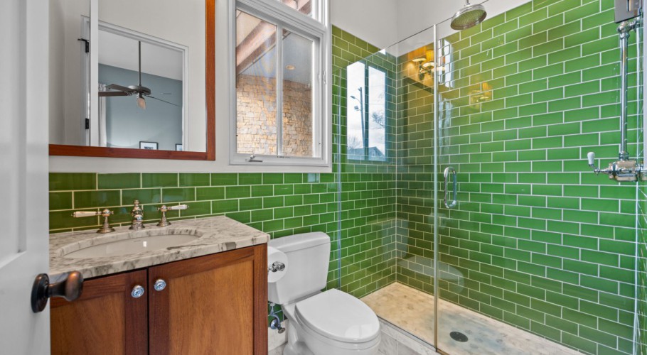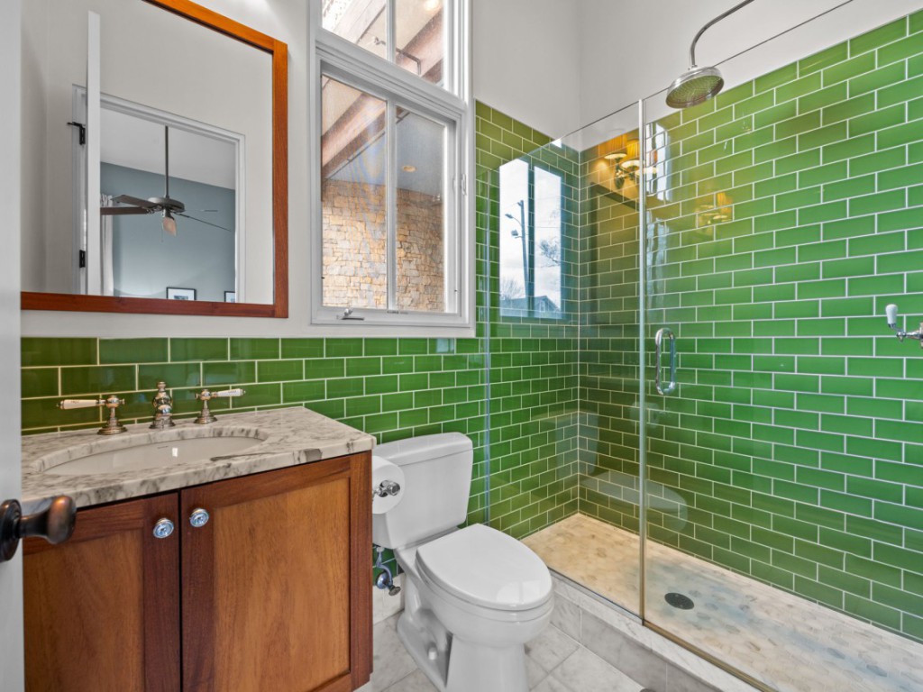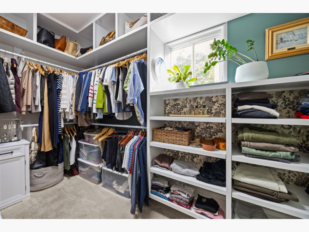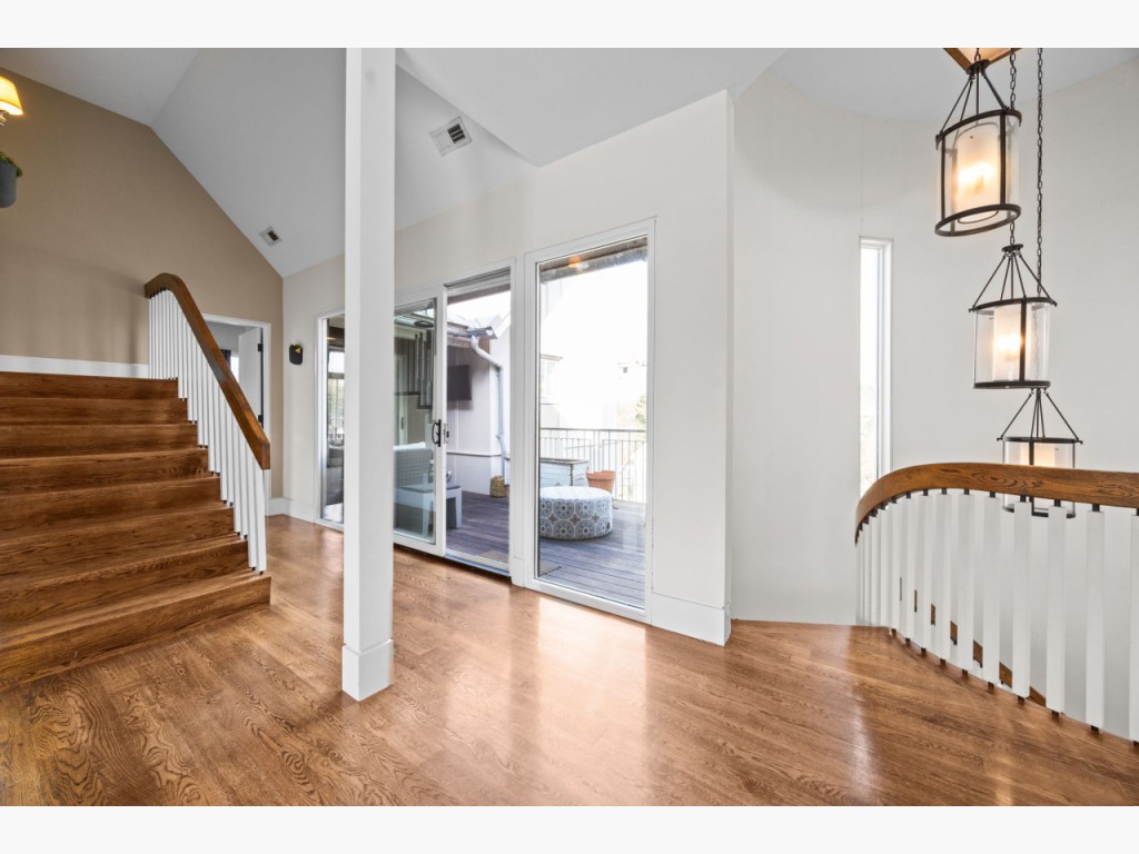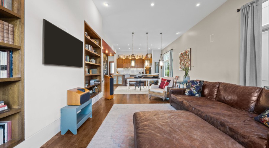 One of the home’s best features is its connection to the outdoors. Glass openings and NanaWall-style doors lead to a private stone courtyard with patio space, landscape lighting, and built-in speakers, creating a rare indoor-outdoor experience in downtown Raleigh. Upstairs, the primary suite includes a spa-style bath, generous custom closet space, and a private sun porch/balcony retreat. The third floor adds bonus space, built-in seating, extra storage, and skyline views.
