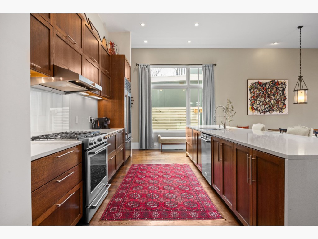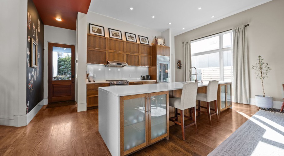 The main level offers soaring 14-foot ceilings, hardwood floors, large windows, custom built-ins, and seamless flow for daily living or entertaining. The kitchen features Silestone counters, a large island, substantial custom cabinetry, walk-in pantry, Sub-Zero refrigerator, and professional gas range. A main-floor guest suite adds flexibility for visitors, multigenerational living, or private office use.