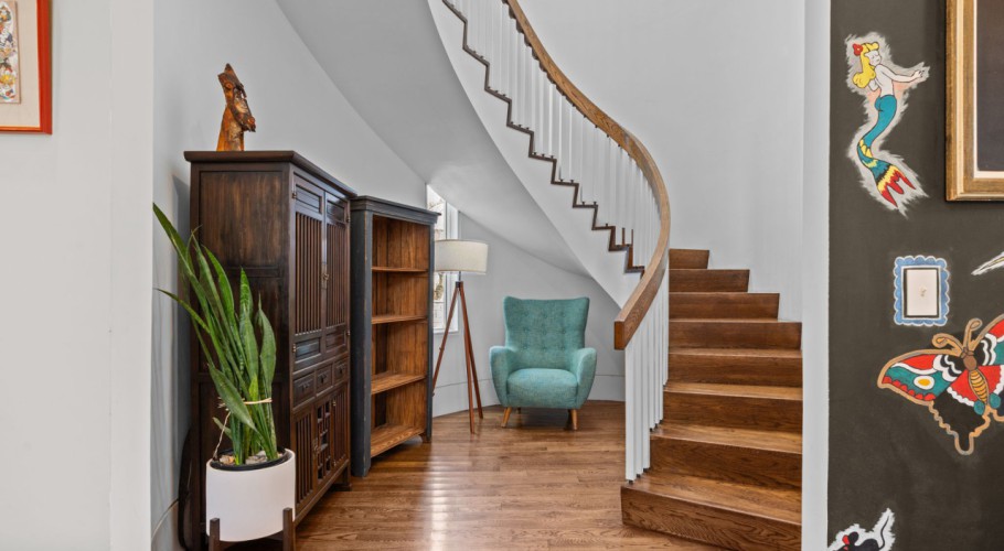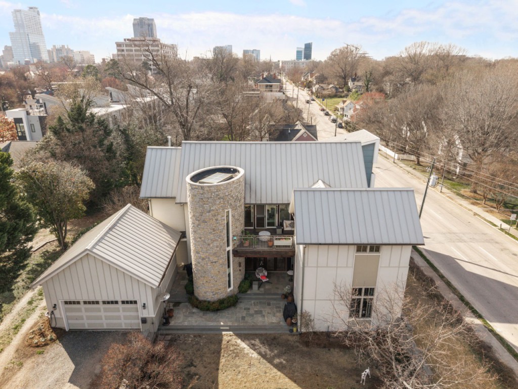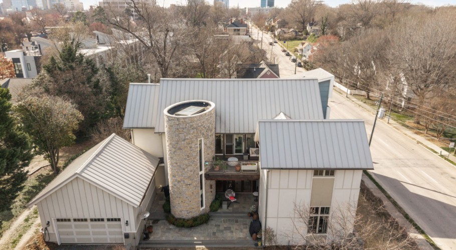 Modernist Victorian by Brett Hautop and Chad Parker of former Vernacular Studios of Raleigh, just outside Historic Oakwood and moments from downtown Raleigh. This architect-designed home is anything but standard, blending traditional scale with clean modern lines, exceptional natural light, and one unforgettable focal point: a custom two-story spiral staircase set inside a rounded granite tower.