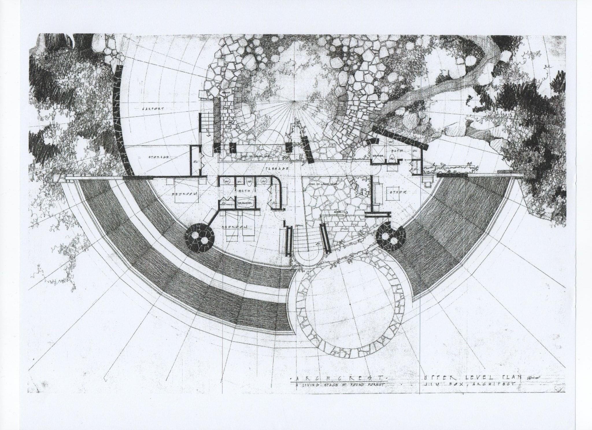 1967 - The deVille House, aka Whiteside Villa, 165 Deville Drive, Highlands NC. The main architect for the house was Robert Opsahl, with Jim Fox collaborating. Jeff Cox also participated. Fox designed the furniture. Available for rental. According to granddaughter Anne deVille, "Whiteside Villa was the dream of my grandmother, but the local architects at the time told her, 'You can't build on that rock!' Then my grandmother discovered these 'hippies' who said, 'Not only can you build on that rock, you can have a home that looks like no other.' My grandmother was so smitten with these creative gents, she also asked them to also design her furniture. It was the perfect intersection of an artistic client and eager architects wanting to break the mold of conventional home design. My grandmother wanted to incorporate native stones as well as wormy chestnut from a demolished cabin. That inspired these young architects even more. Having grand ideas and designs is meaningless, however, if no one can actually build them. There were incredible craftsmen back then, too, and they vied for the opportunity to show off their expertise. The house has stood the test of time. While the harvest gold carpet and avocado green appliances have been replaced, the house remains a structurally sound work of art." 1968 - aka Prairie Spiral, Lima OK. Unsure if built.