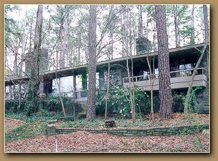 1954 - The I. Jesse Dowdy Residence, 1846 Hammond Street, formerly 1720 Co-Ah-Bar Street, Rocky Mount NC. 2.6 acres. Commissioned 1952. Dowdy named the street, which stands for "cabin on a hill by a river." Originally, it was Ho-Ah-Bar Street, for "house on a hill by a river." Say it a few times, and you'll see why the name was changed. Dowdy had the house sited to survive floods, which it did several times, especially in 1999. While other houses nearby were washed away, this one was undamaged (the lower-elevation swimming pool, however, was not so lucky). The house is the finest surviving example of Modernist architecture in town. Built by S. S. Toler and Son, according to former employee Norman Chambliss. The landscape architect was Edwin Gilbert Thurlow. E. L. Hunley was the engineer. The entrance to the property is around the corner at 1800 Hammond. Harrell did an addition in 1966. The house originally included radiant heat floors (no longer operational, replaced by traditional HVAC unit). The flagstone terrace overlooks the Tar River. The exterior walls are six-inch stacked Georgia stone. Inside, cypress and oak paneling, bamboo floors, hidden closets, and multiple fireplaces. Sold in 1973 to Cash W. Haggerty Sr. Was on the market 2008-2012. Sold in 2012 to Robert Hyatt. Sold in 2025 to Alina Shevlak and Richard Laws. Sources include: Dallas Times Herald, 3/18/1980; Vertical Files, Barker Texas History Center, University of Texas at Austin; Who's Who in the South and Southwest 1968-69; Mark Dilworth of Omniplan; realtor Nancy Liipfert; Janet Hicks Bethune; Haggerty's daughter Theresa Harrell. |