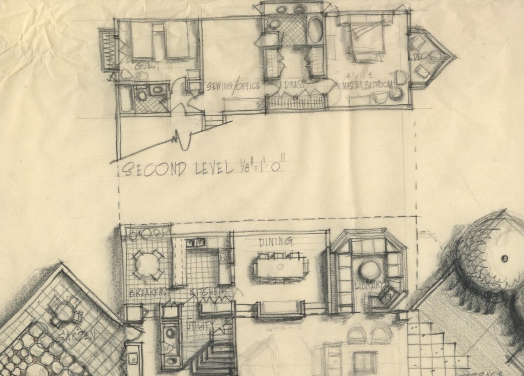 1987 - The Vincent J. and Lynda M. Calabrese Residence, 6357 Sharon Hills Road, Charlotte NC. Commissioned 1984. 5000 square feet, 5 acres, four bedrooms. Includes a staircase that wraps around the chimney. Sold in 2004 to Paul M. and Linda Vezolles. Still owners as of 2024.
